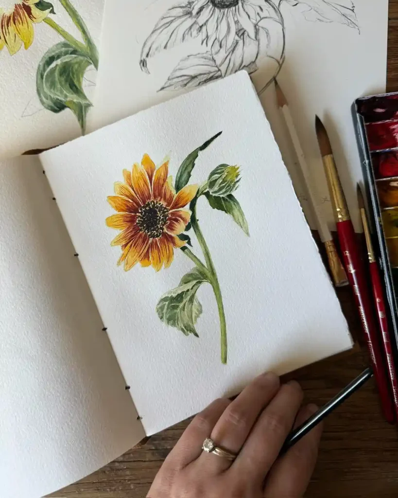 A lovely little study from an artist’s sketchbook. This delicate watercolor captures a single sunflower stalk, complete with a blooming flower and a new bud. The piece has a fresh, observational quality, beautifully rendering the fiery orange center and the soft green leaves on textured paper. A perfect capture of a moment in the garden.