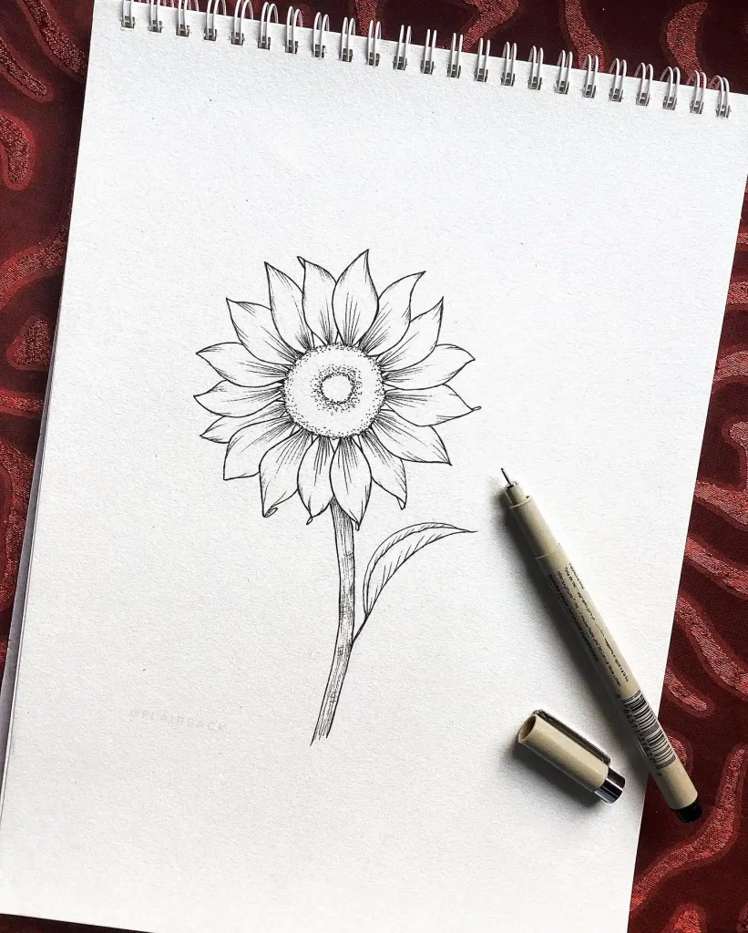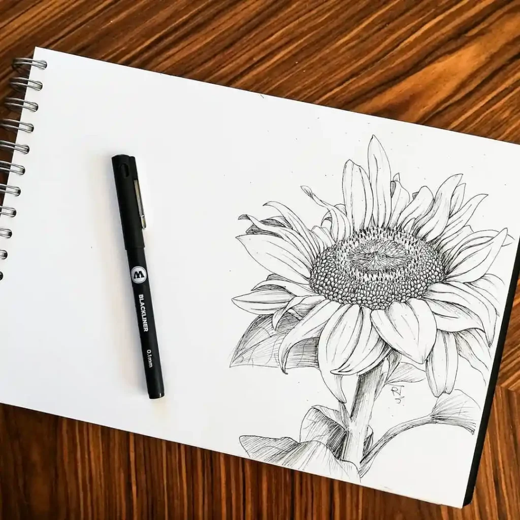 This ink drawing has such a dynamic feel, thanks to its interesting perspective. The artist chose a low angle, looking up at the sunflower, which gives it a sense of grandeur. The detailed linework and careful cross-hatching create a fantastic sense of texture and form, proving that you can achieve incredible realism with just a simple black fineliner.
