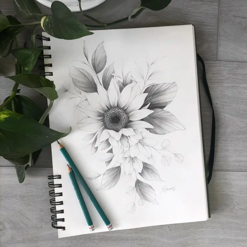 What a beautifully soft and elegant floral arrangement. The artist uses graphite with a masterful touch, creating incredibly smooth and gentle shading that gives the petals a velvety texture. The sunflower, nestled among other delicate leaves and blossoms, is the clear star of this romantic and beautifully composed bouquet. A truly stunning piece.