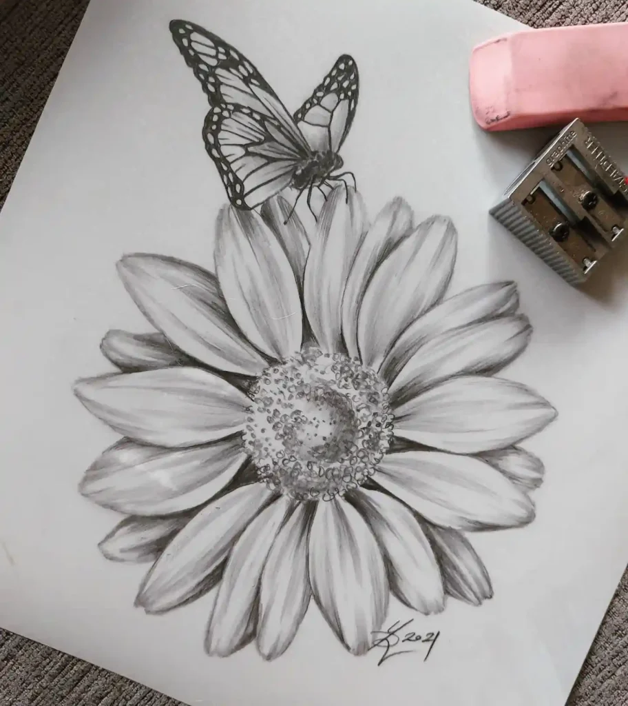 This beautiful pencil drawing tells a simple, lovely story of a summer day. A detailed Monarch butterfly has gently landed atop a lush, fully bloomed sunflower. The artist’s soft, realistic shading is fantastic, capturing the delicate texture of the flower’s petals and the intricate patterns on the butterfly’s wings. A truly serene and beautiful moment.