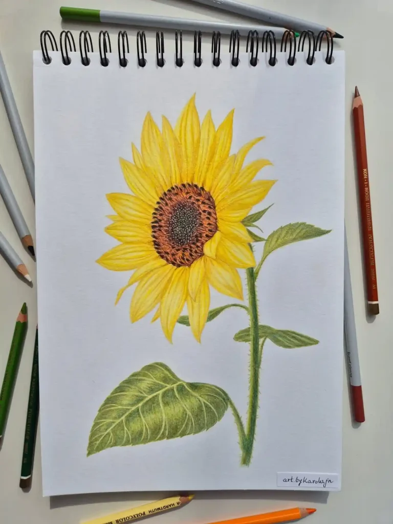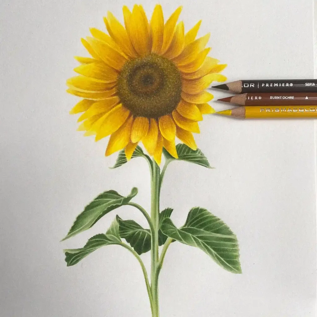 A beautiful and realistic take on a sunflower, rendered in colored pencil. This piece has the feel of a classic botanical study, with its accurate form and attention to detail. The artist has done a fantastic job capturing the subtle color variations in the yellow petals and the intricate vein structure on the large green leaf.