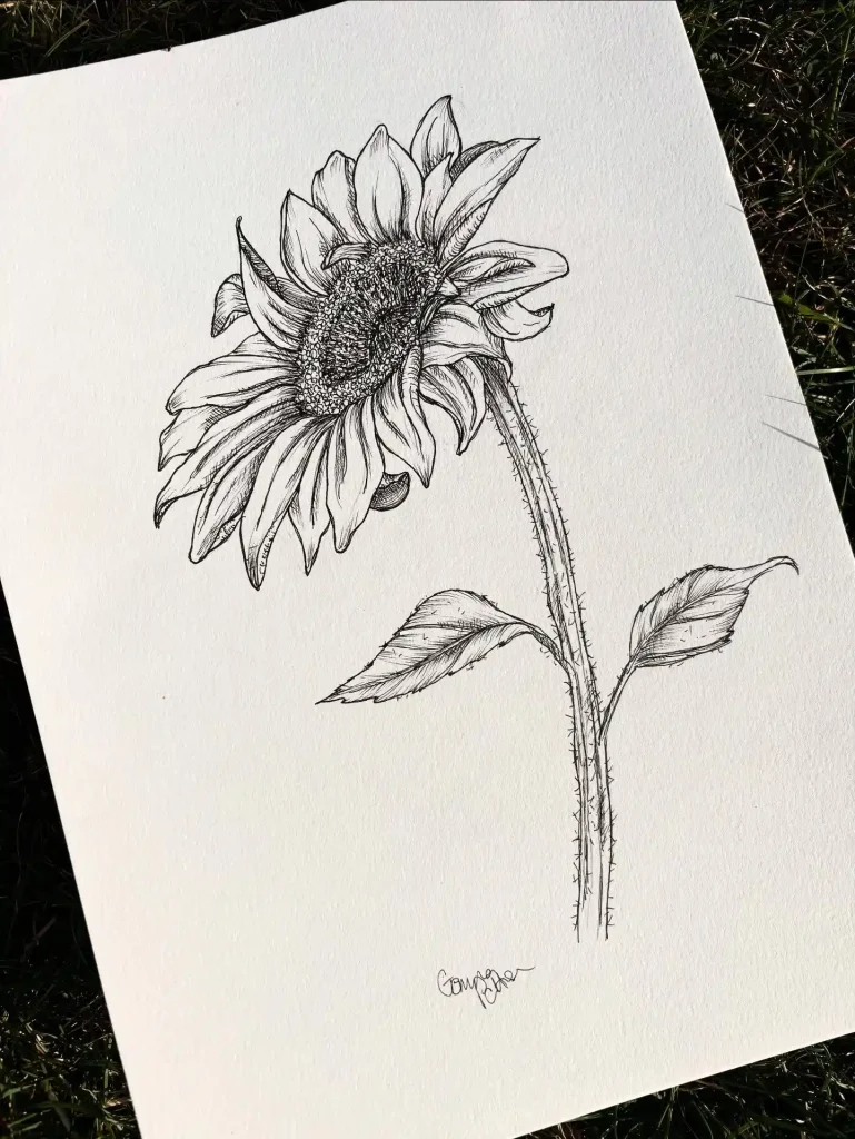 With the precision of a classic botanical illustrator, the artist has captured the natural grace of a sunflower in ink. Every detail, from the slightly drooping petals to the hairy texture of the stem, is rendered with fine, confident lines. It’s an elegant and timeless piece that celebrates the intricate beauty of this beloved flower.