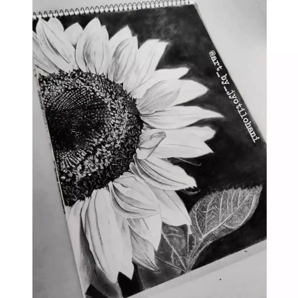 This beautiful graphite study uses a clever composition, showing just half of the sunflower to draw the viewer in. The artist’s detailed pencil work is fantastic, capturing the delicate veins in each petal and the complex, seeded texture of the flower’s center. It’s an elegant and well-executed piece that focuses on form and detail.