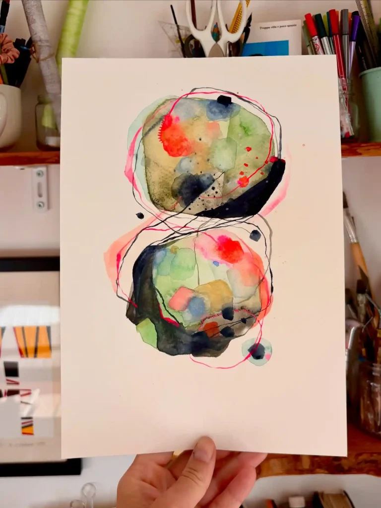 This piece is all about balance. I love stacking these two organic orbs, letting them feel connected yet distinct. Using wet-on-wet watercolor allows the bright reds and earthy greens to bleed naturally. The scribbled pink and black ink lines then add a layer of chaotic energy, tracing the forms and tying the whole composition together. It feels both cellular and cosmic.