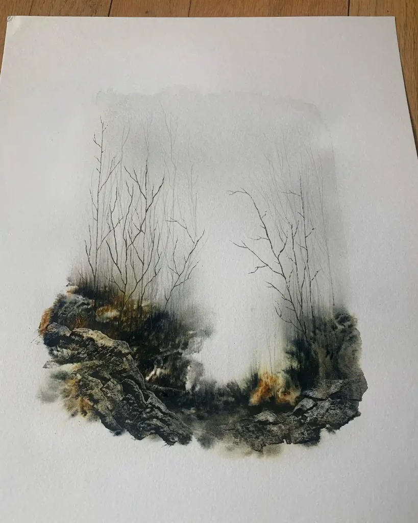 What incredible control of atmosphere. This piece is a masterclass in contrasting textures. The artist built up the foreground with dark, complex, and granular watercolor to create those rocky forms. Then, they used delicate, fine-line ink for the bare trees, letting them just fade away into the soft, misty wash of the background. It creates a powerful sense of depth.