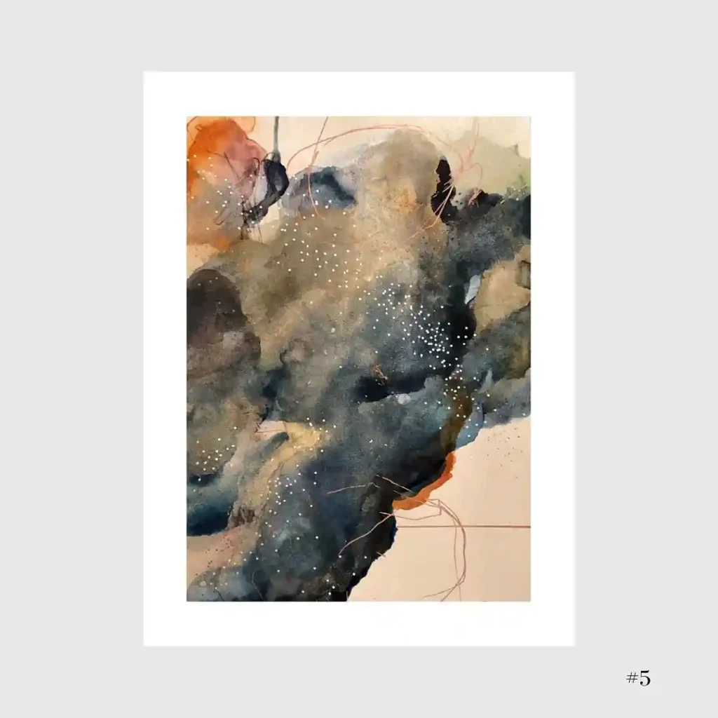 This has such a great mid-century modern vibe. It’s all about these two simple, biomorphic forms and how their colors interact. The artist used beautiful, clean washes, letting the yellow and orange bleed into the light blue base. That separate, darker orb creates a perfect focal point and a sense of gravitational pull. It feels very balanced and design-oriented.