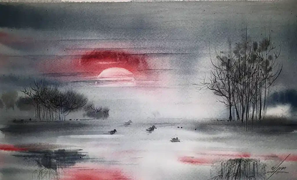 This is all about mood. The artist used a very limited palette—mostly greys—which makes that single burst of red sun so powerful and symbolic. It creates a focal point of warmth in a cold scene. The wet-on-wet technique in the sky and water gives it that soft, hazy, end-of-day feeling. The silhouetted trees and ducks really complete the sense of stillness.