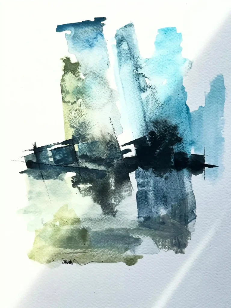 A study in atmosphere. This piece is all about capturing the mood of a misty horizon or a blurred reflection. I used broad, vertical strokes of wet watercolor, letting the blues and earthy greens granulate and fade. That strong, dark horizontal brushstroke cuts right through, anchoring the composition and giving it a sense of place. It’s minimalism with a lot of feeling.