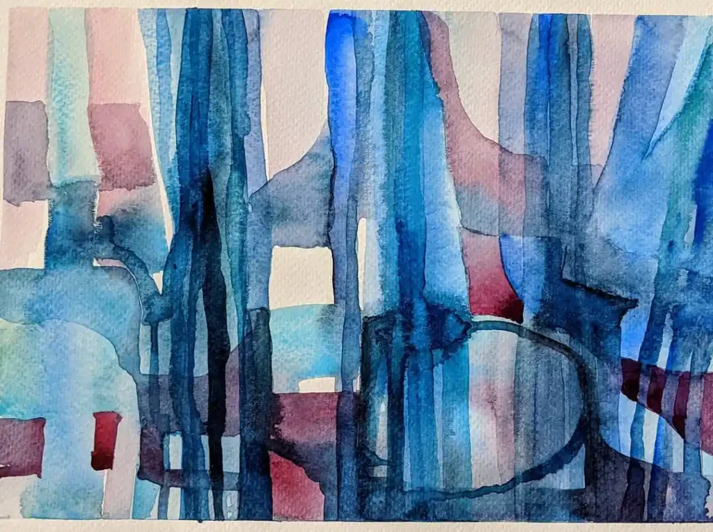 I really love playing with transparency here. This composition is built from overlapping vertical washes of blue and indigo. Those pops of muted red add a bit of warmth to an otherwise cool palette. The negative white spaces are key—they act like windows, creating a sense of an abstract, watery city. It’s a study in layering.
