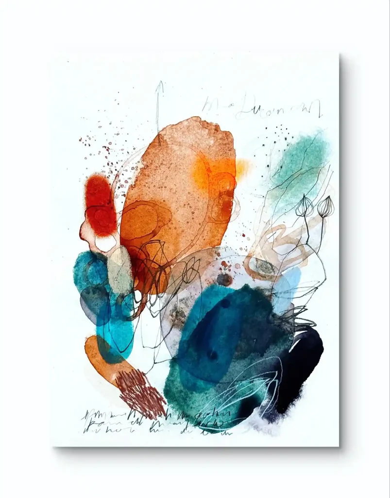 What a fun exploration of mixed media. This piece is all about layering spontaneous marks. I started with big, wet washes of watercolor, loving how that rusty orange plays against the deep teal. Then, I went in with fine-line ink, adding chaotic scribbles and delicate botanical sketches. The splatters and textures just add to that raw, energetic, “in-the-moment” feeling.