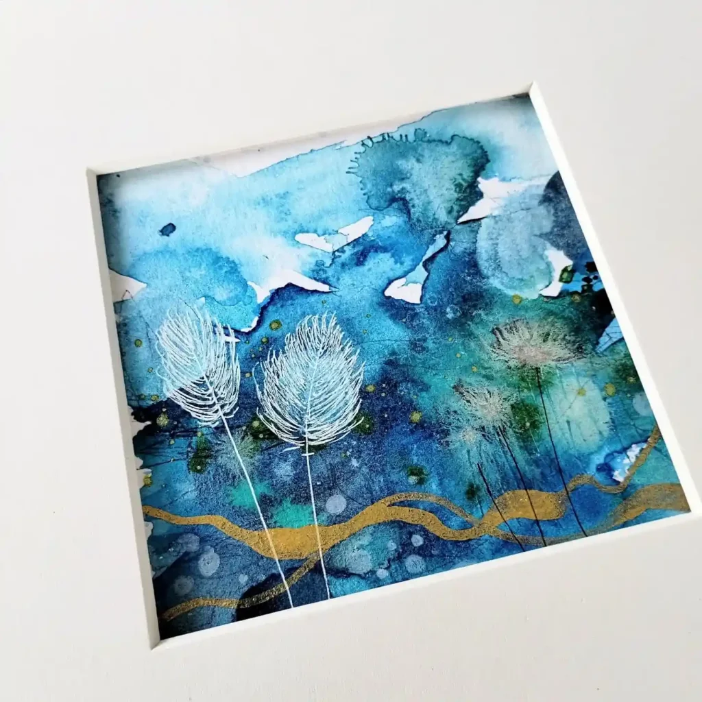 This piece is a dive into deep, saturated color. I flooded the paper with rich blues and teals, letting the pigments bloom to create an underwater feel. The magic happens when that dries, and I come in with fine white ink to draw those delicate, ethereal seed heads. That single, flowing gold line adds a touch of warmth and guides the eye.