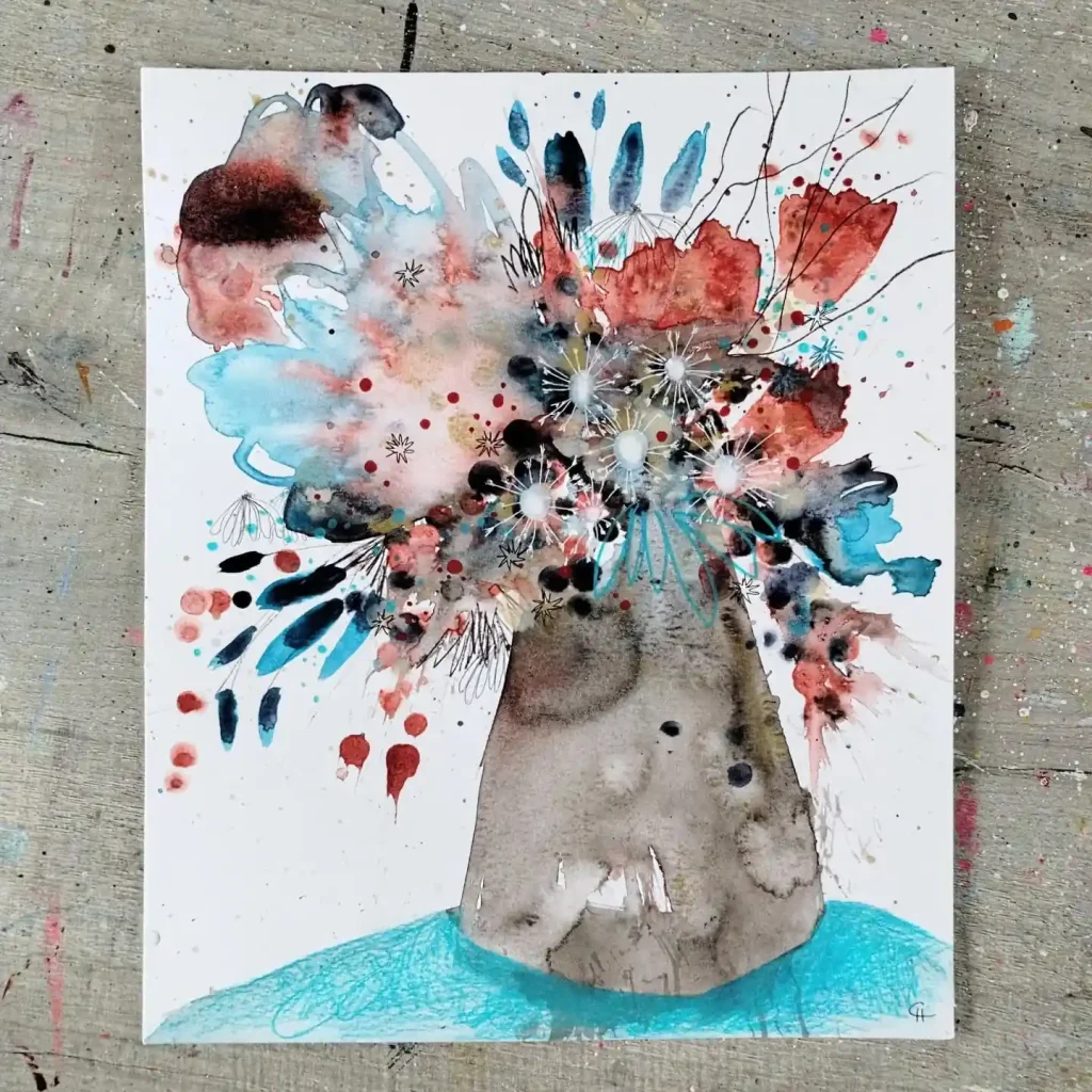 Just a pure explosion of joy. I started with a simple, solid vase shape to ground the whole piece. The bouquet itself is all about chaotic energy—a mix of watercolor splatters, blooms, and drips in bright red and blue. I went back in with ink to add whimsical, spiky flowers and delicate seed pods, finding order within the beautiful mess. It’s meant to feel wild.