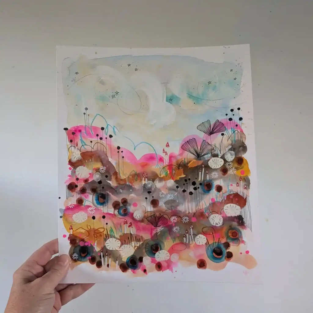 This is just a field of pure play. It’s a whimsical, imaginary garden bursting with life. I started with soft watercolor washes in pinks, browns, and yellows to create the landscape. Then, the real fun began: using an ink pen to draw all kinds of stylized flowers, dots, circles, and stems. It’s a “more is more” approach, creating a magical, storybook feeling.