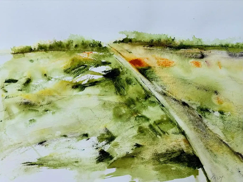 This piece is less about a specific place and more about the feeling of an open field. I worked very quickly, wet-on-wet, letting the olive greens, yellows, and that surprise pop of orange bleed together. It captures that sense of wild, sunlit grass. The strong diagonal line—maybe a path or a fence—cuts through the composition and draws your eye right into the hazy distance.