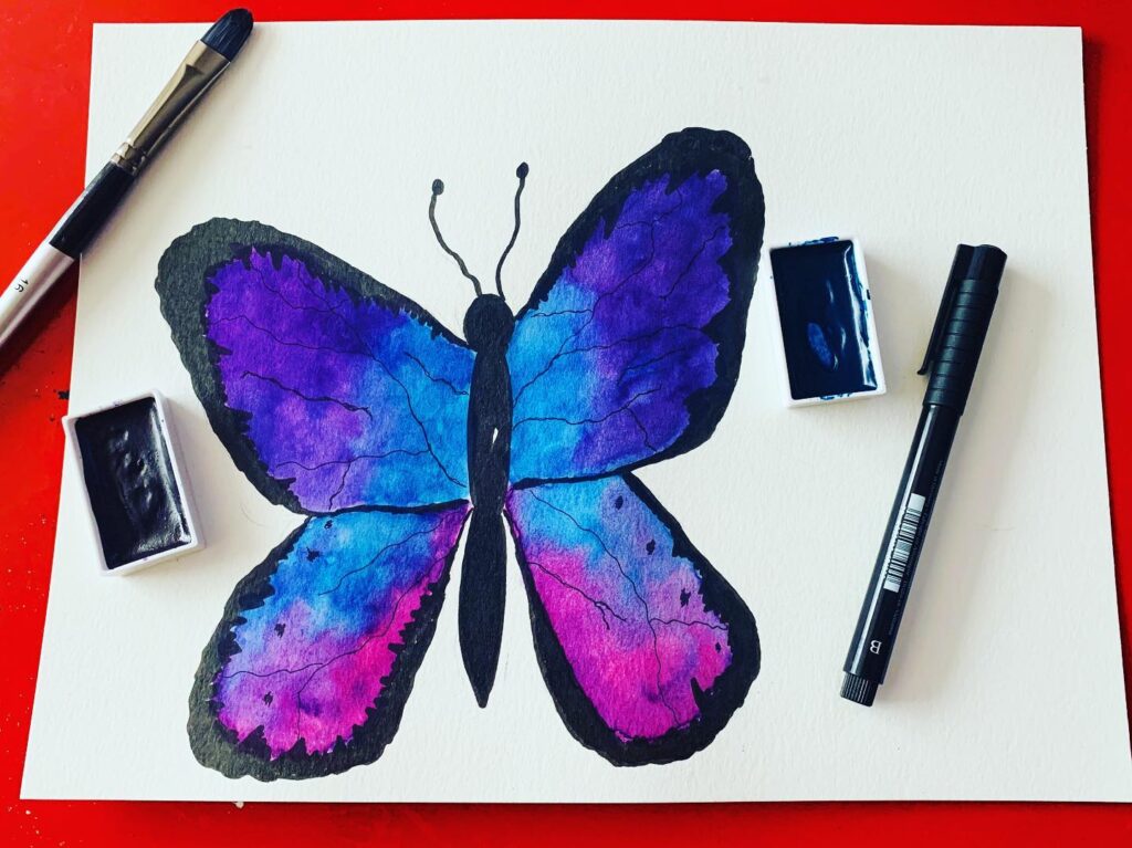 This image showcases a beautifully crafted watercolor painting of a butterfly, blending vibrant shades of blue, green, and purple. The delicate details and splashes of color highlight the artist’s creativity. The tools, including a fine brush and white gel pen, suggest precision and artistic flair in the creation process.