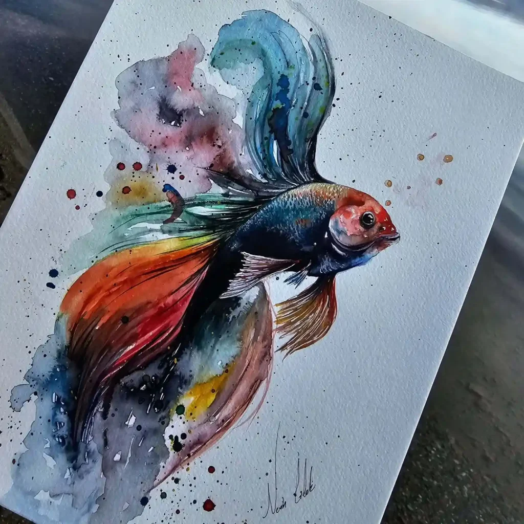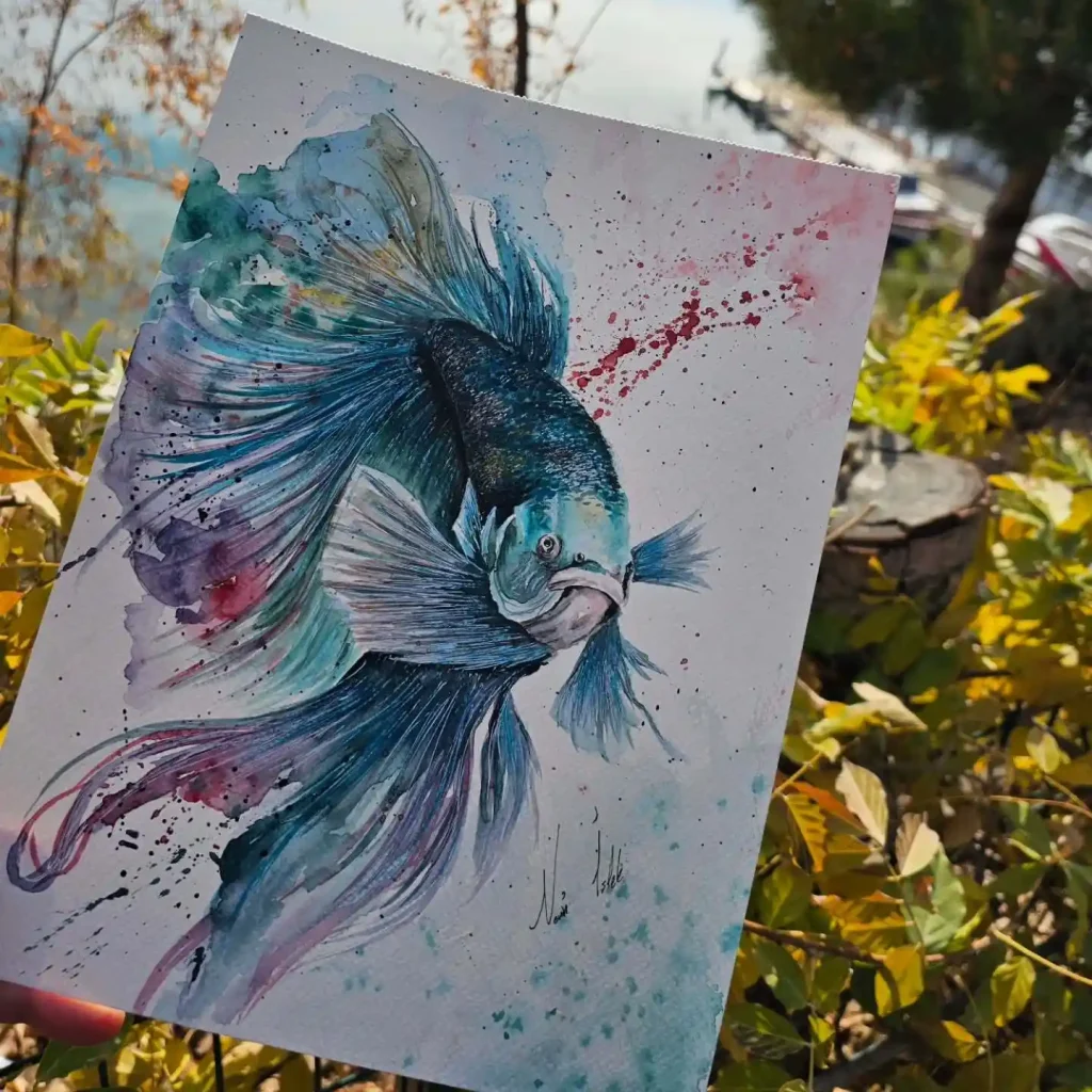 This painting captures the elegance of a Betta fish in motion. The artist’s use of cool blues and soft purples creates a sense of depth and grace. Splashes of red and turquoise mimic water’s unpredictability, symbolizing freedom and emotional strength. It’s a stunning fusion of movement, emotion, and watercolor artistry.