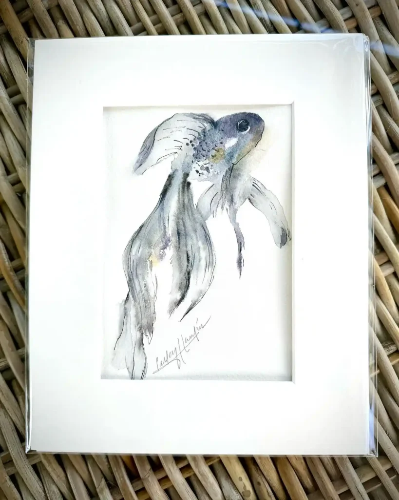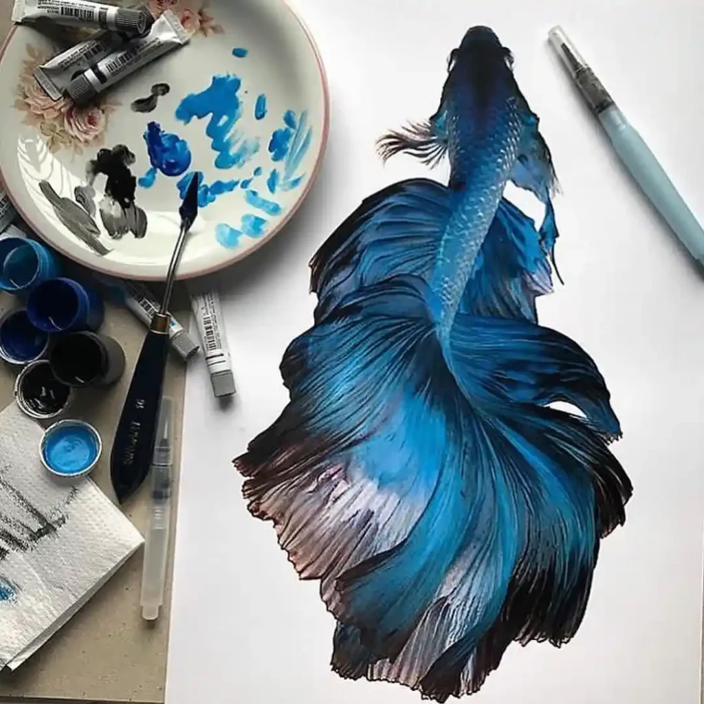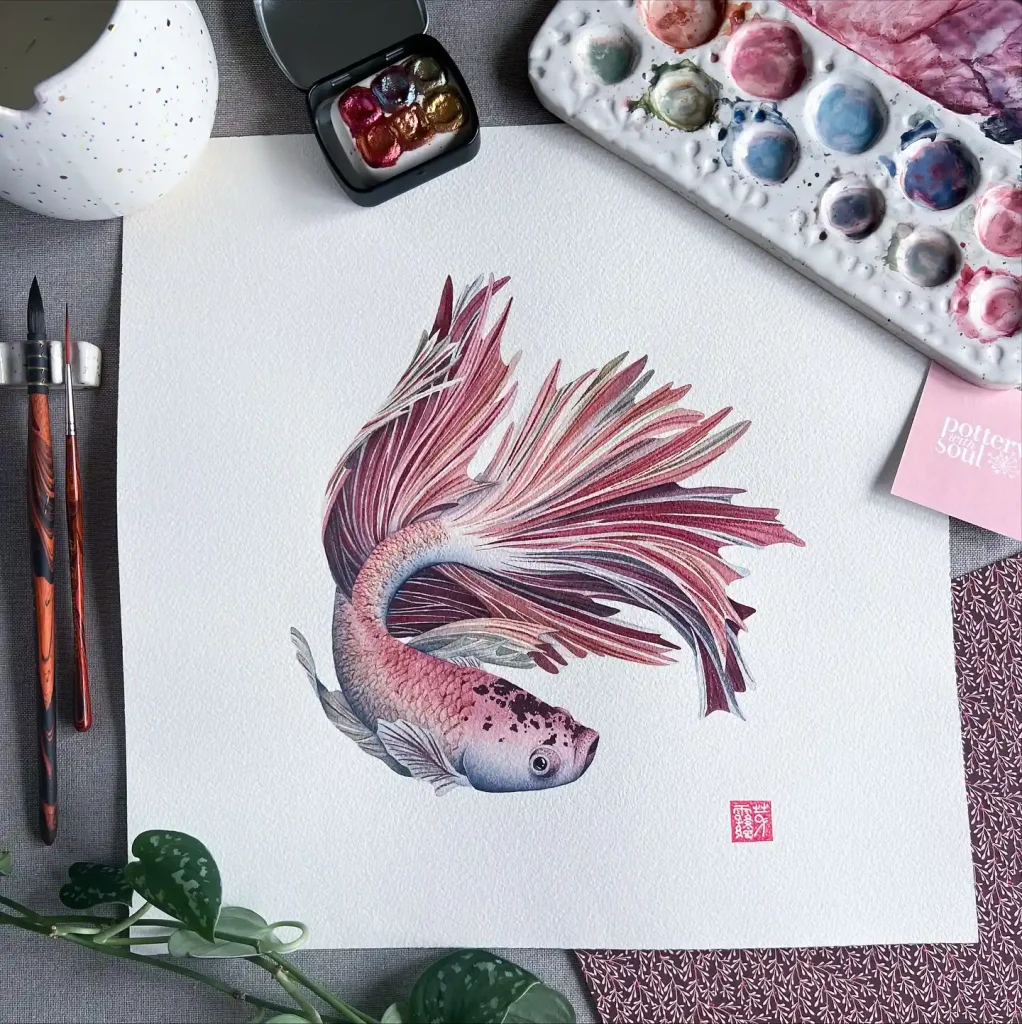 This soft watercolor depiction of a Betta fish feels delicate and ethereal. The muted grays and gentle blues convey quiet beauty and fluidity. With just a few expressive strokes, the artist evokes motion and grace, symbolizing tranquility and emotional introspection—proof that less can truly mean more in art.