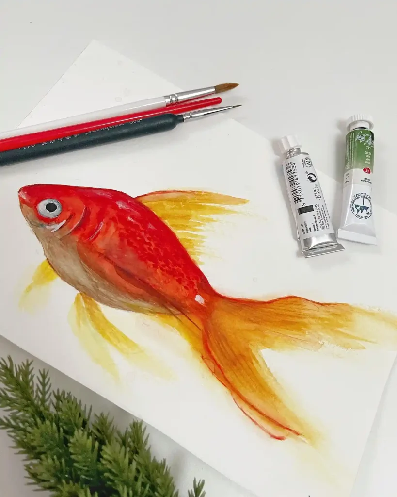 - Adding Fins and Tail: Paint the fins and tail with a very light, almost transparent orange wash. Add delicate lines with a darker shade to suggest the fin rays while they are still damp.