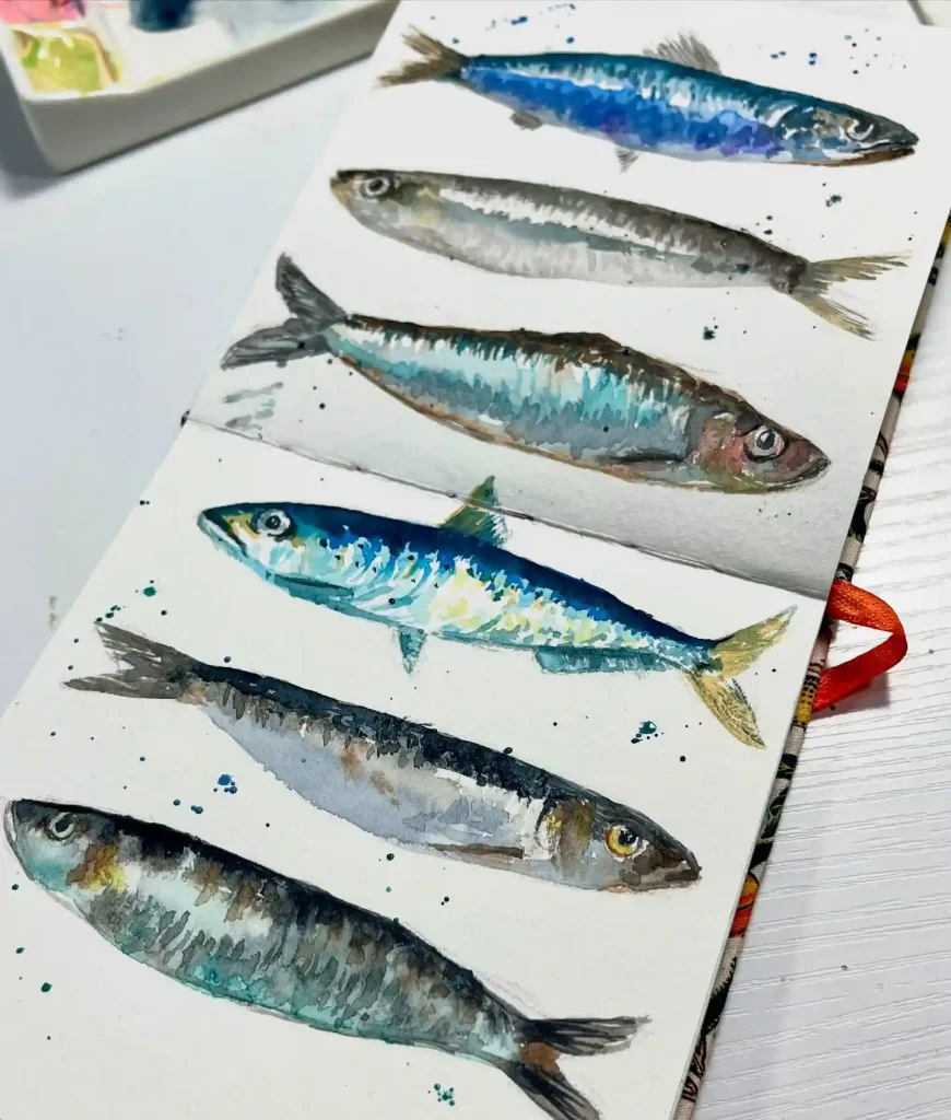 These watercolor sardines shine with lifelike metallic tones, their silvery blues and greens reflecting natural light beautifully. Each fish varies slightly, showing individuality within unity—a subtle nod to teamwork and adaptability. The loose, painterly strokes add freshness and rhythm, making this study both realistic and artistically expressive.