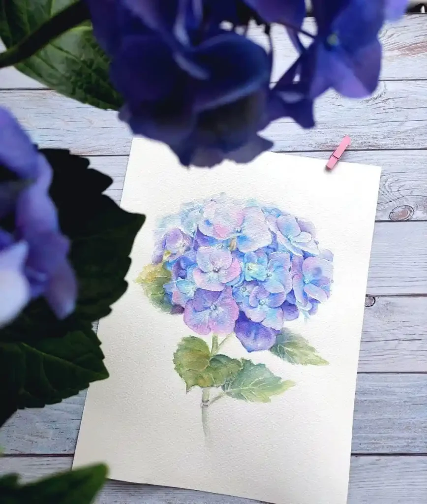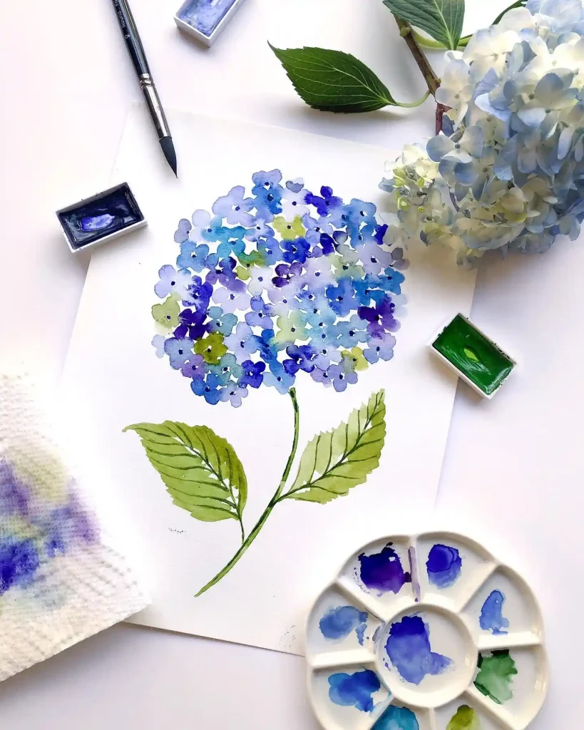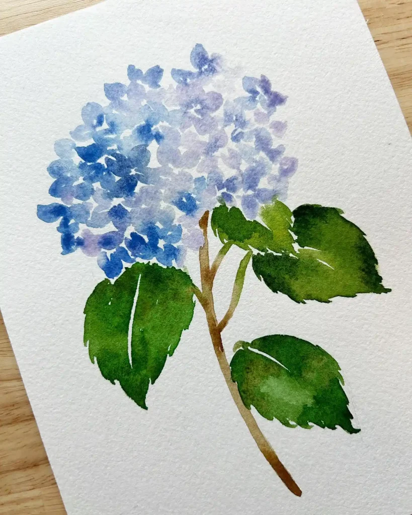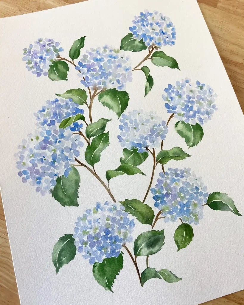 - Simple composition setup: Sketch loose clusters first, then flood with diluted cerulean blue base; ideal starter watercolor hydrangea drawing idea for quick skill gains.