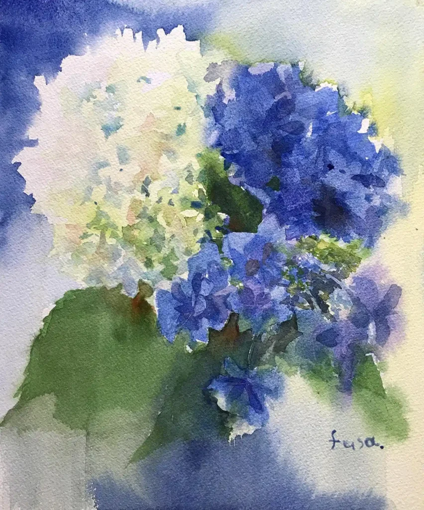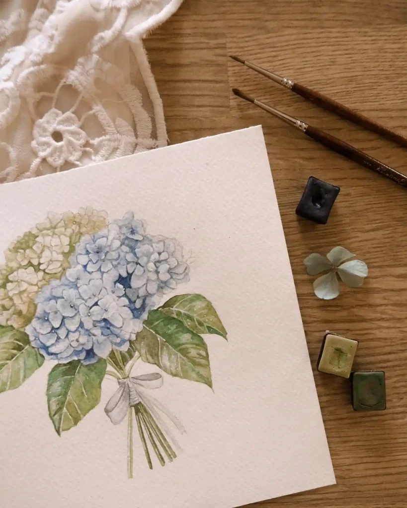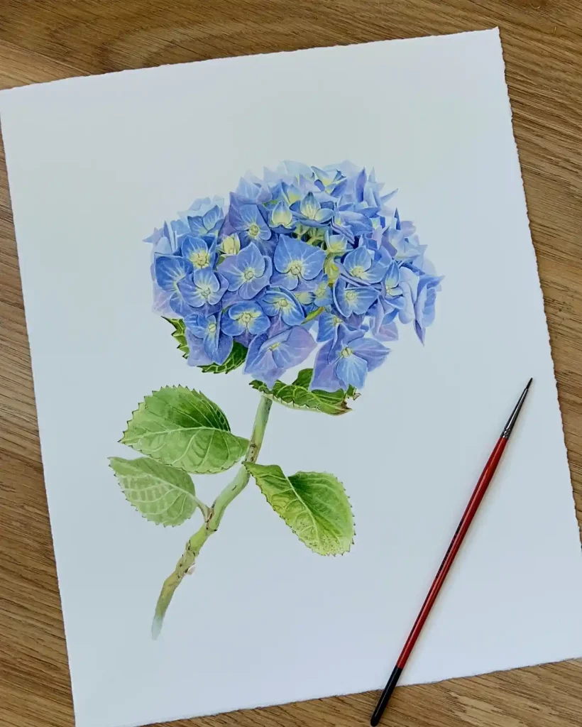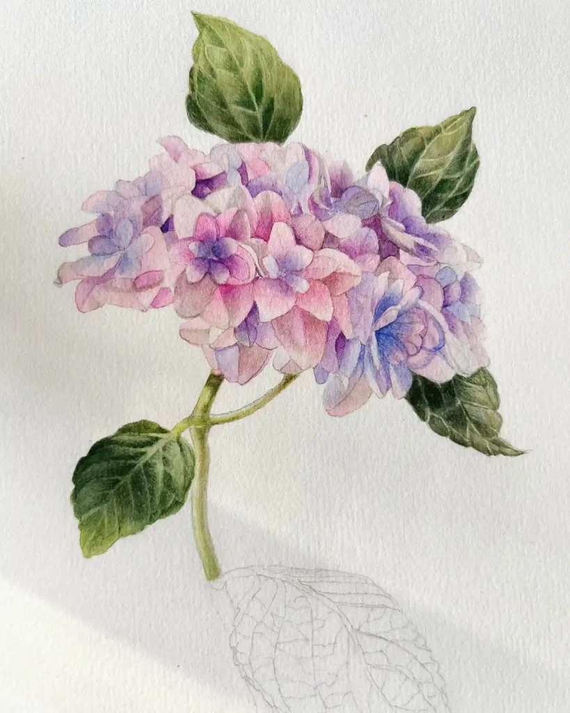 - Simple composition setup: Sketch loose clusters first, then flood with diluted cerulean blue base; ideal starter watercolor hydrangea drawing idea for quick skill gains.