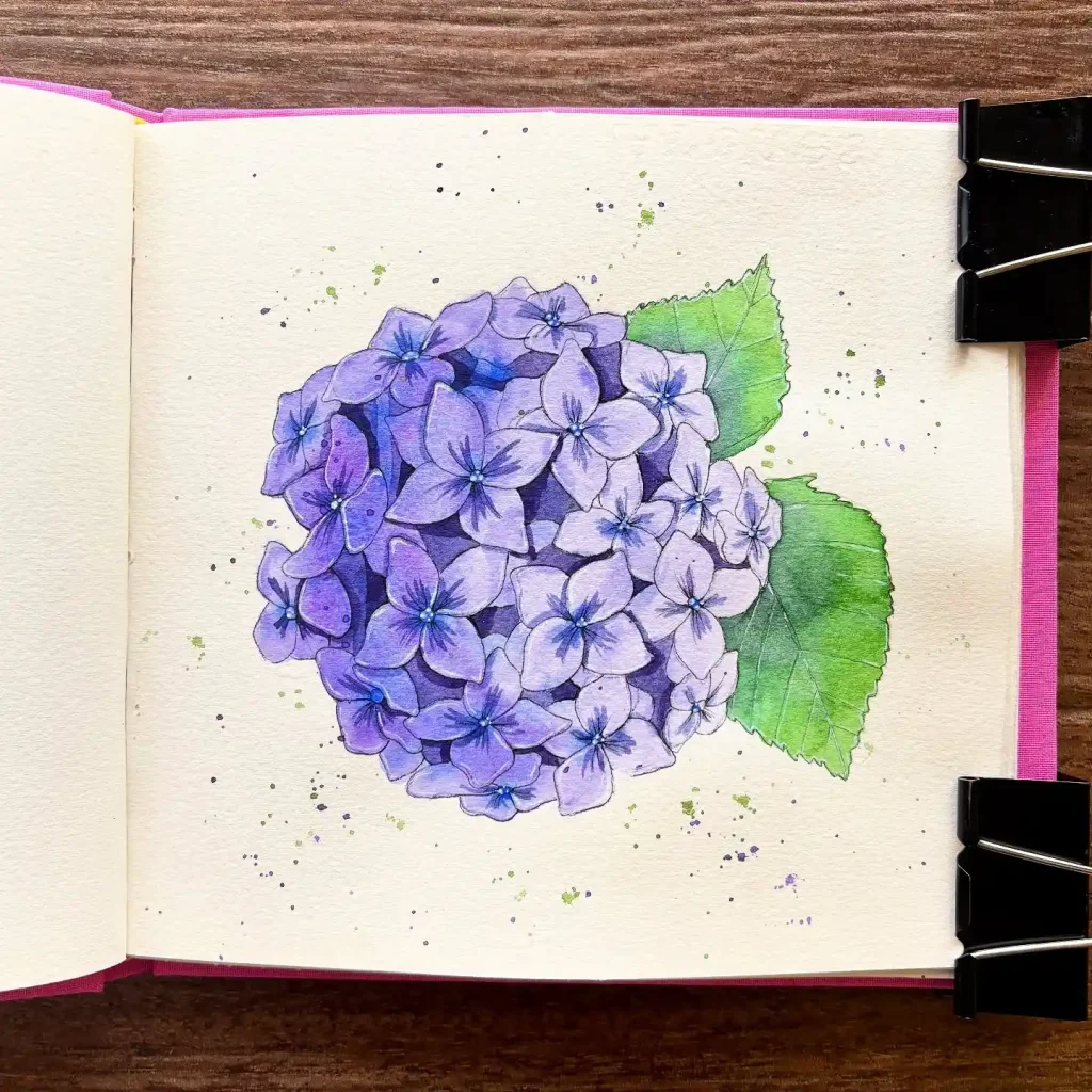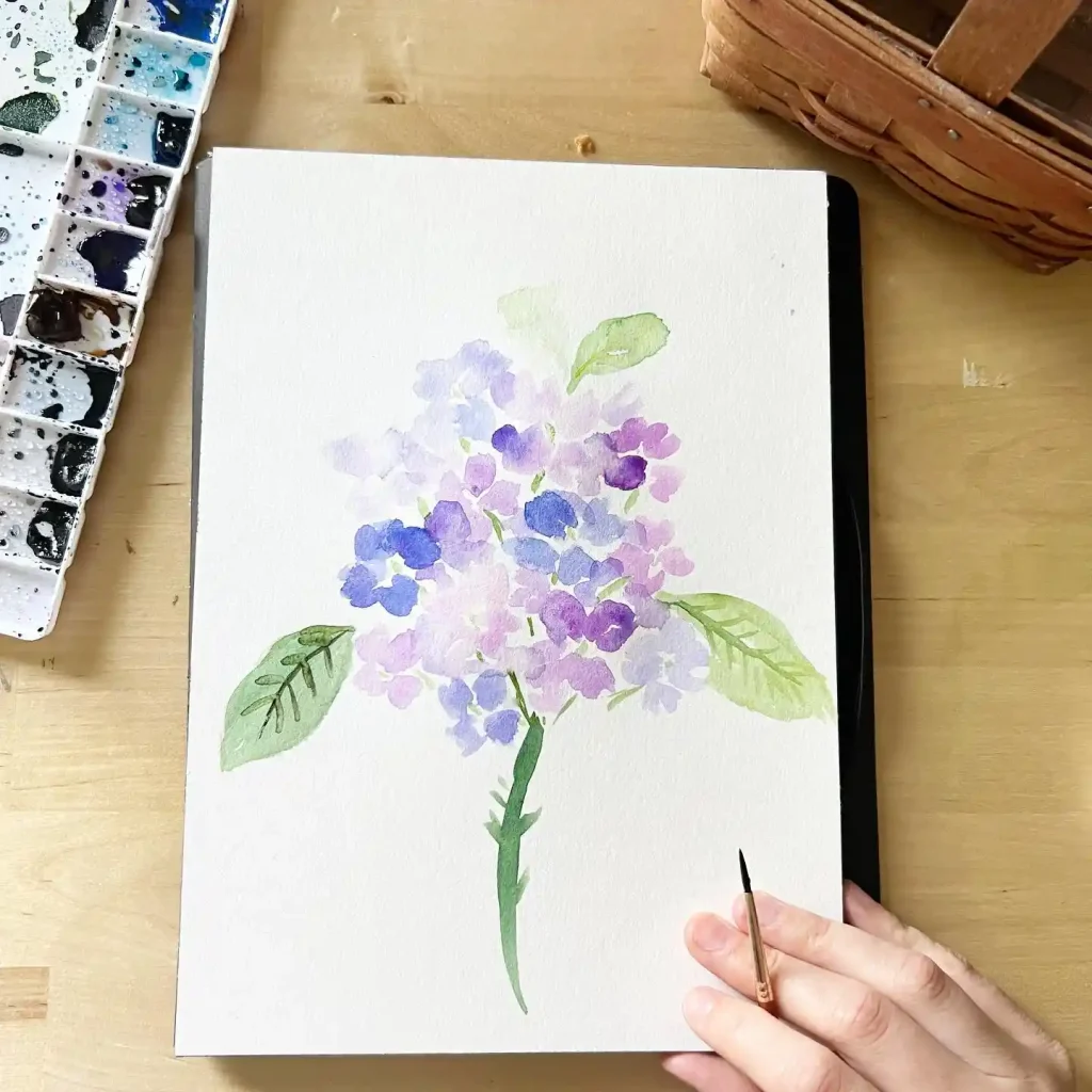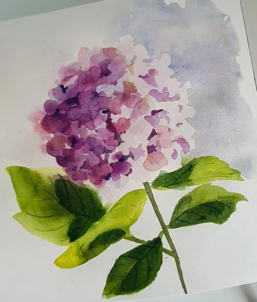 - Layer wet-on-wet for soft blooms: Start with pale blue and purple washes on damp paper for hydrangea petals’ fluffy texture; let colors blend naturally for depth (key watercolor hydrangea drawing idea for beginners).