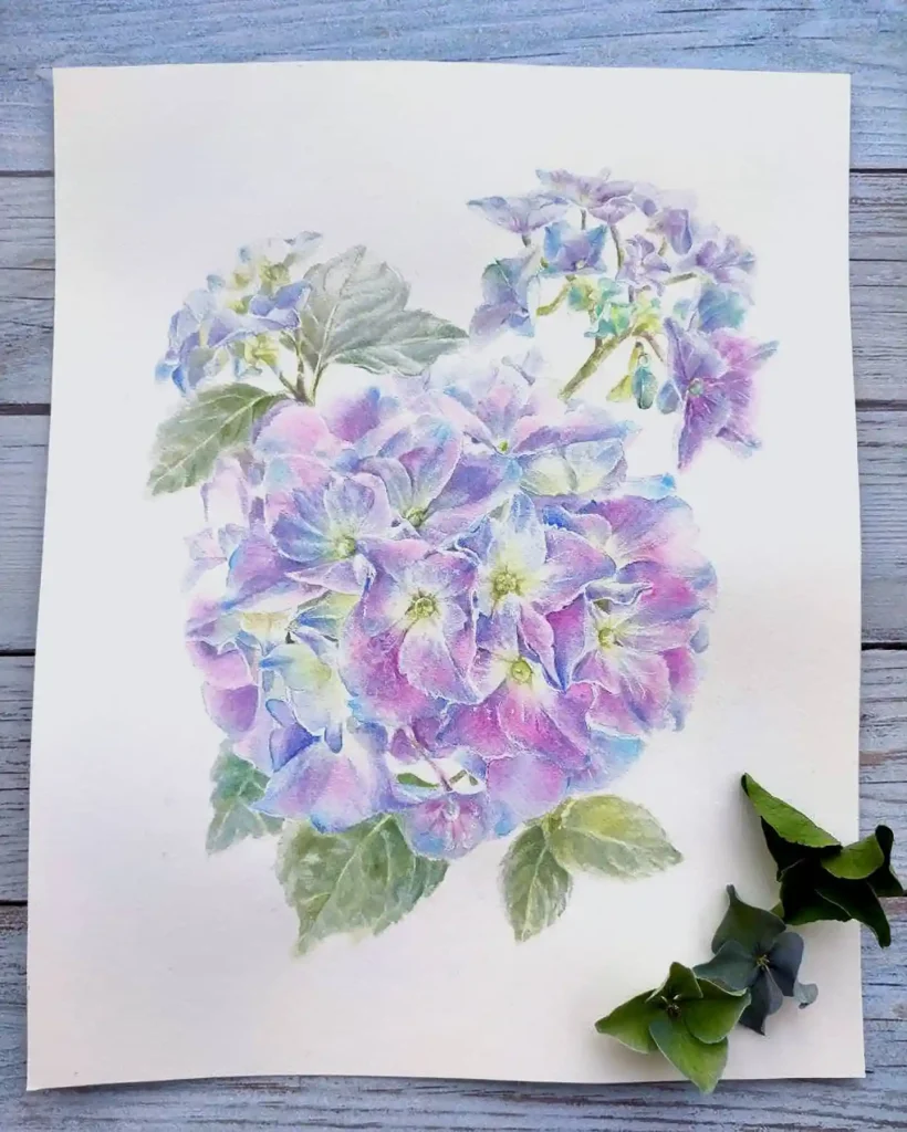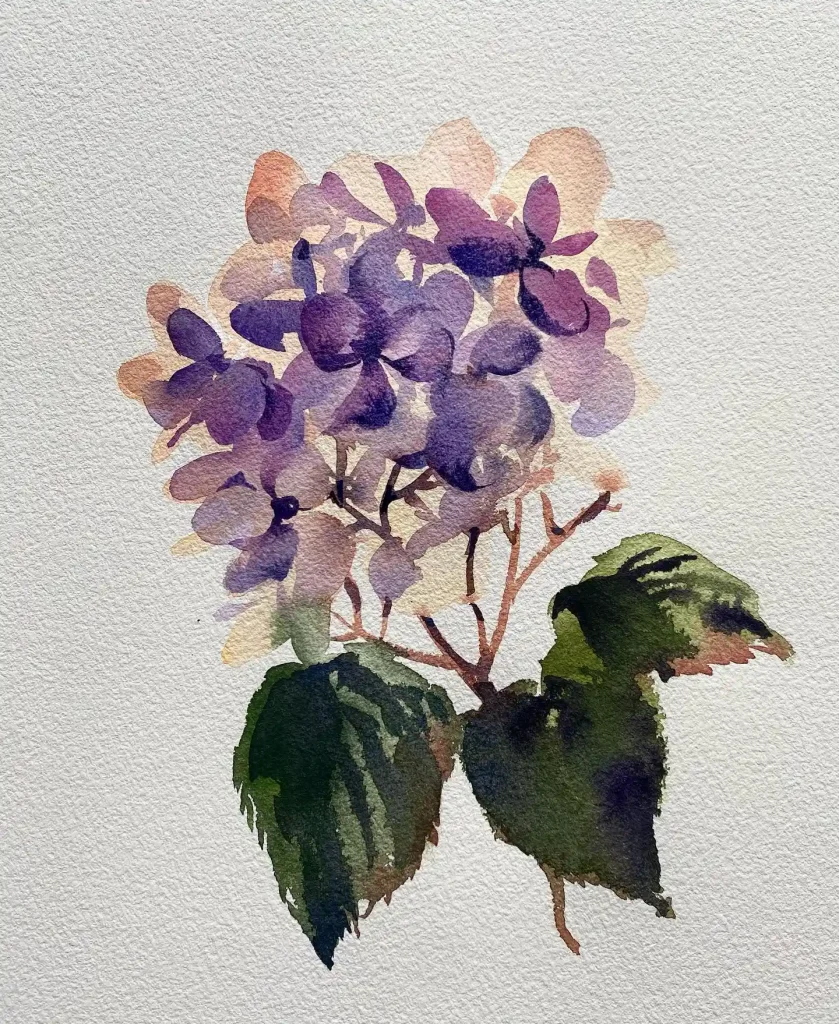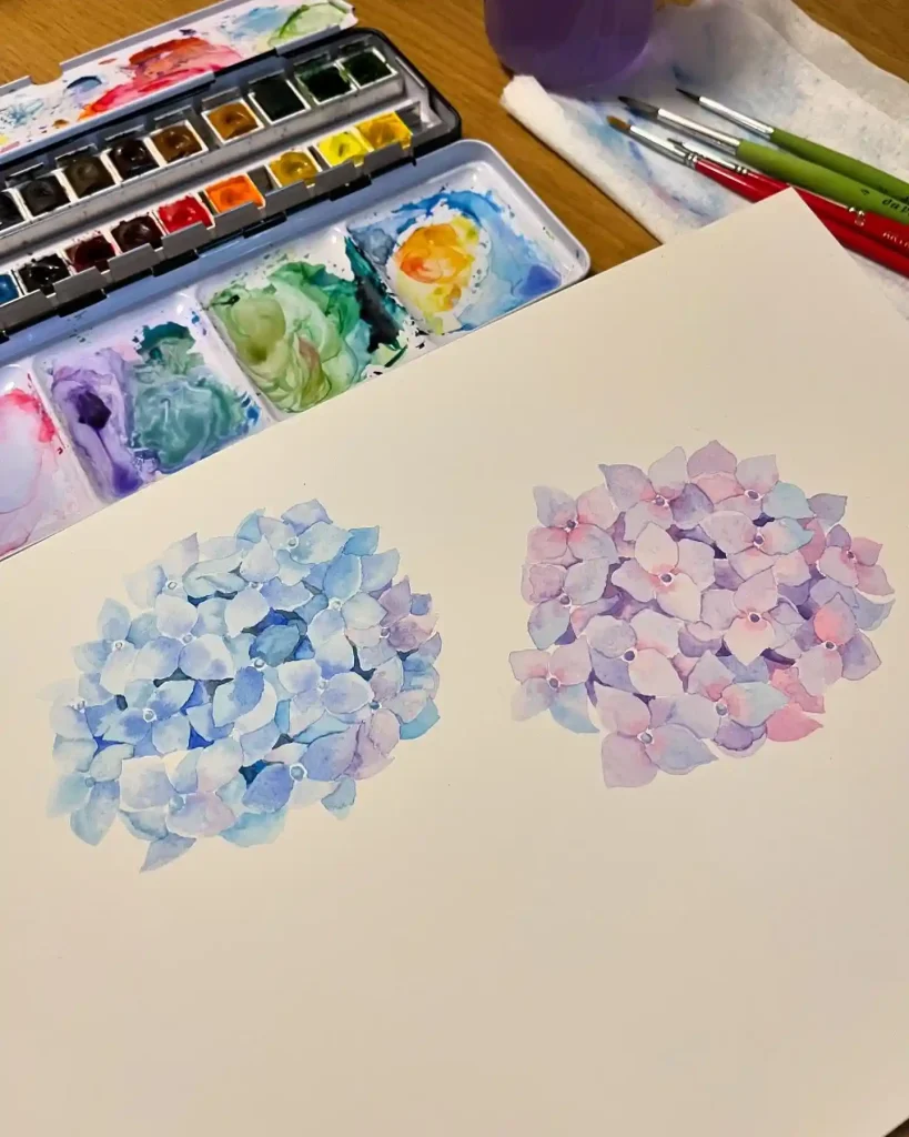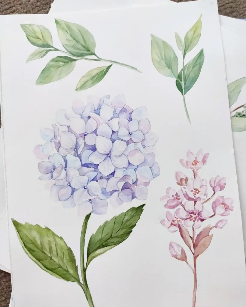 - Layer wet-on-wet for soft blooms: Start with pale blue and purple washes on damp paper for hydrangea petals’ fluffy texture; let colors blend naturally for depth (key watercolor hydrangea drawing idea for beginners).