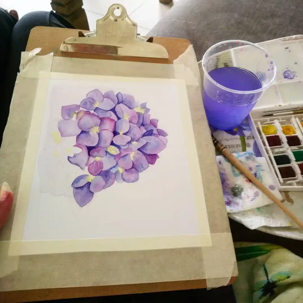 There is a raw beauty in a work in progress. This purple hydrangea is taped securely to a board, suggesting a plein air session or a serious studio study. The cup of purple rinse water is a fun, accidental color match that ties the scene together. It represents the immersive process of painting. The loose washes keep it feeling spontaneous.