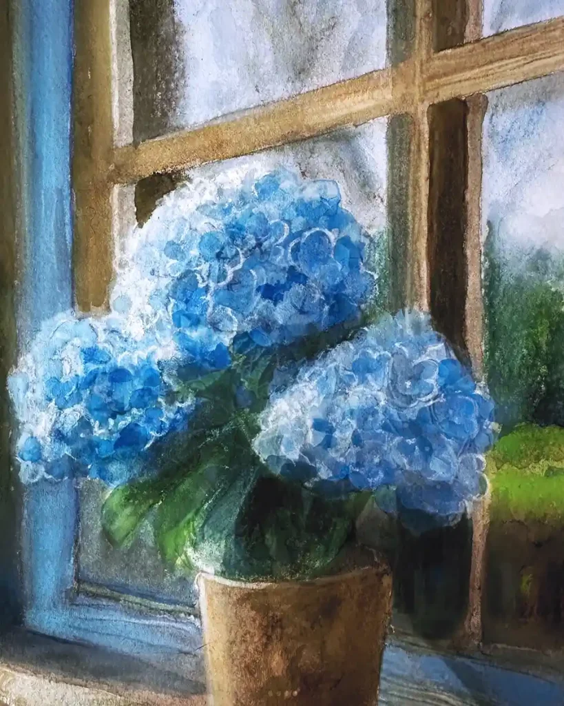Home is where the heart is, and this painting feels like a memory. The vibrant blue blooms sit happily in a pot by the window, bathed in natural light. I used loose, impressionistic strokes to suggest the glass and the greenery outside. It represents the comfort of bringing nature indoors and the quiet peace of a lazy afternoon.