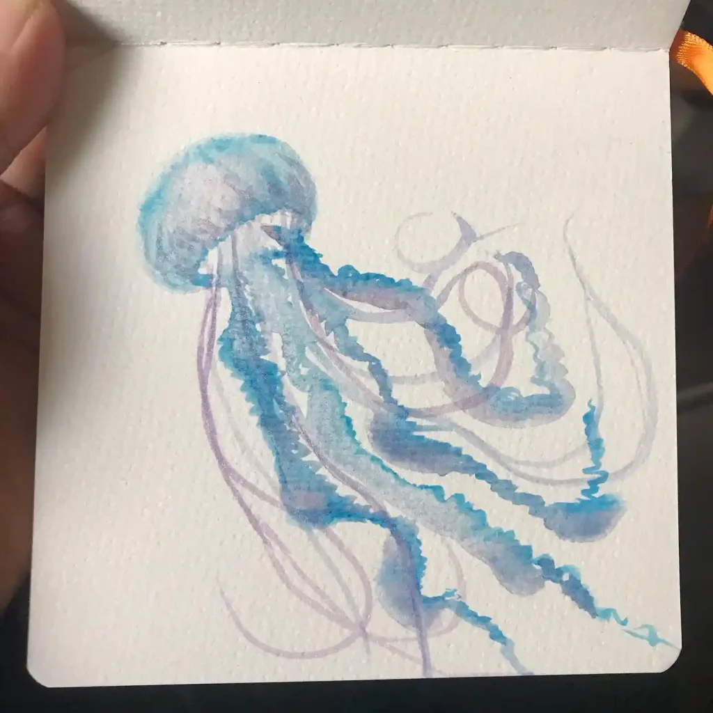 Transparency is the key to capturing a jellyfish’s essence. This sketch uses diluted washes of phthalocyanine blue to create a ghostly, weightless appearance. The ruffled edges of the oral arms are handled with a loose, wiggly brushstroke that mimics movement. It symbolizes the fragile and ephemeral nature of marine life.