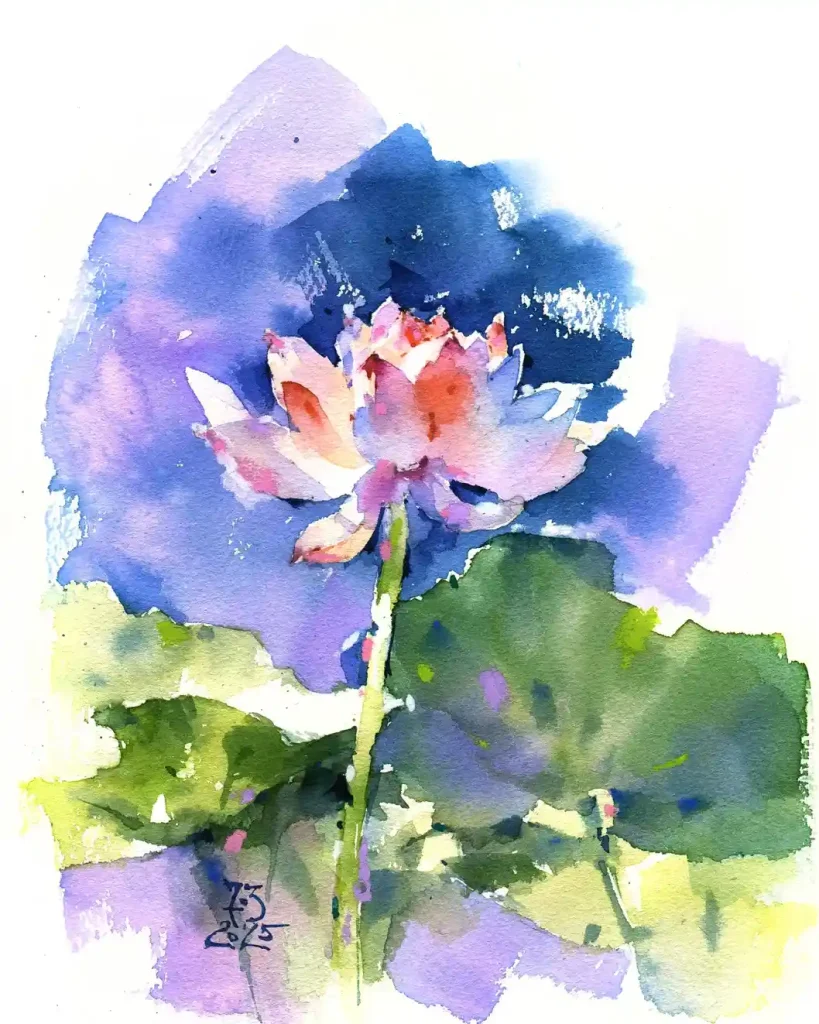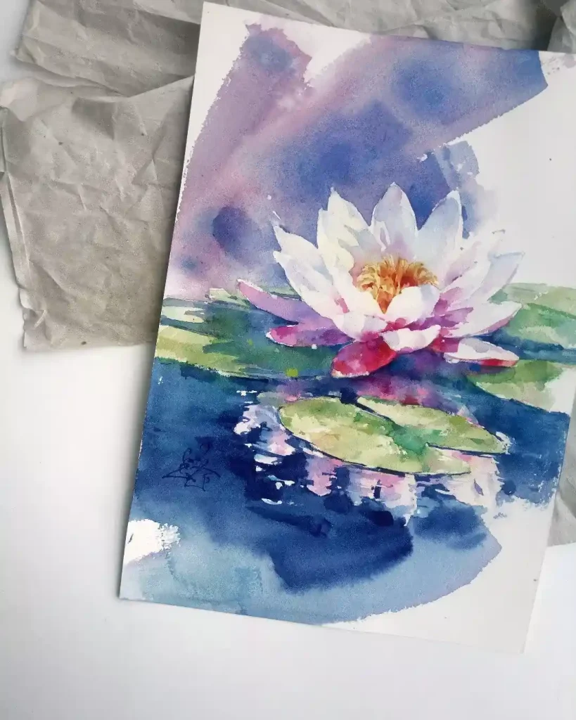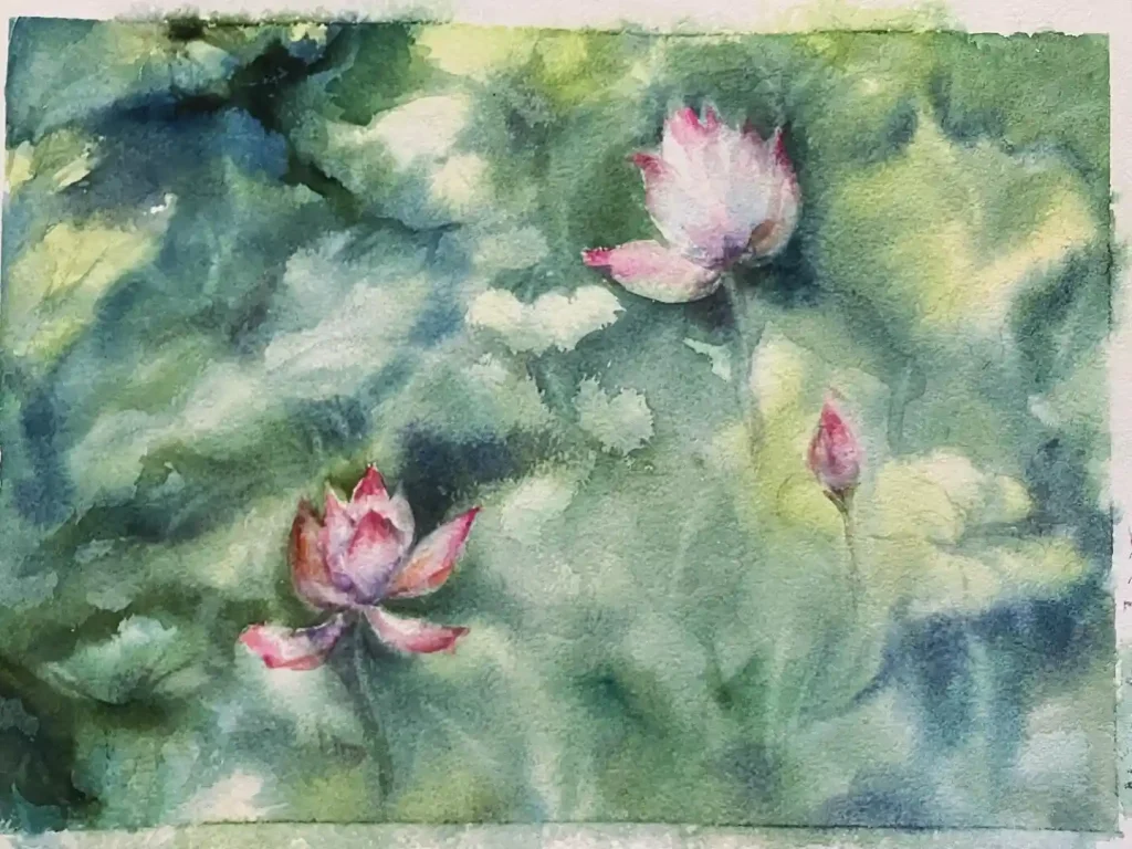 Water is just as important as the flower in this composition. The artist painted a white and a pink lotus floating together, focusing heavily on the ripples and reflections on the surface. Soft, diffused edges create a dreamy, impressionistic feel. It captures the gentle movement of a garden pond stirred by a light breeze.