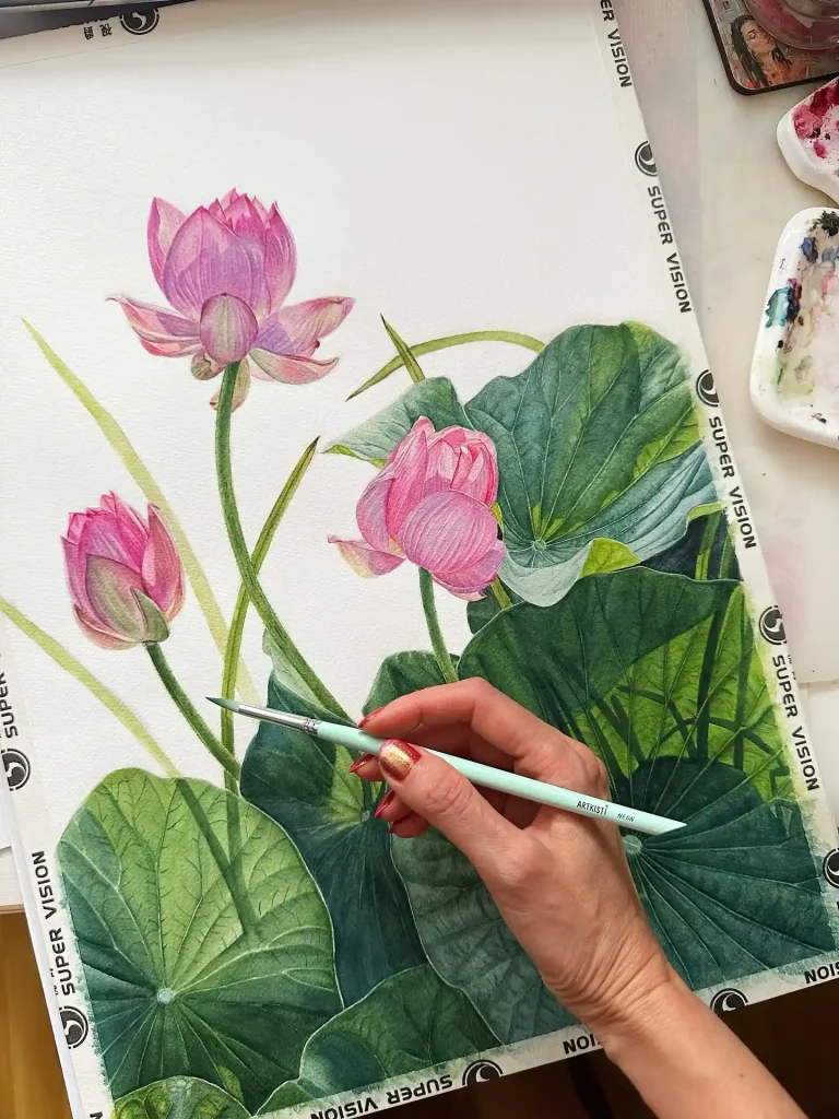 Achieving this level of realism takes layers of patience. This work-in-progress shot shows vibrant pink flowers paired with incredibly detailed leaves where every vein is visible. The artist is using a fine brush to refine the stems. It is a celebration of the lush, vibrant life that thrives in summer ponds.