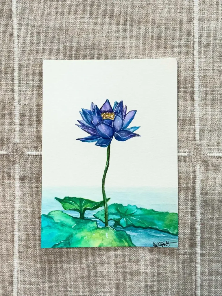Reflections double the beauty of a subject. This piece features a white lotus with pink tips floating on deep blue water, mirrored perfectly on the wet surface. The purple background wash adds a royal, spiritual tone to the scene. It visualizes the concept of “as above, so below,” connecting the ethereal flower with the grounding water.