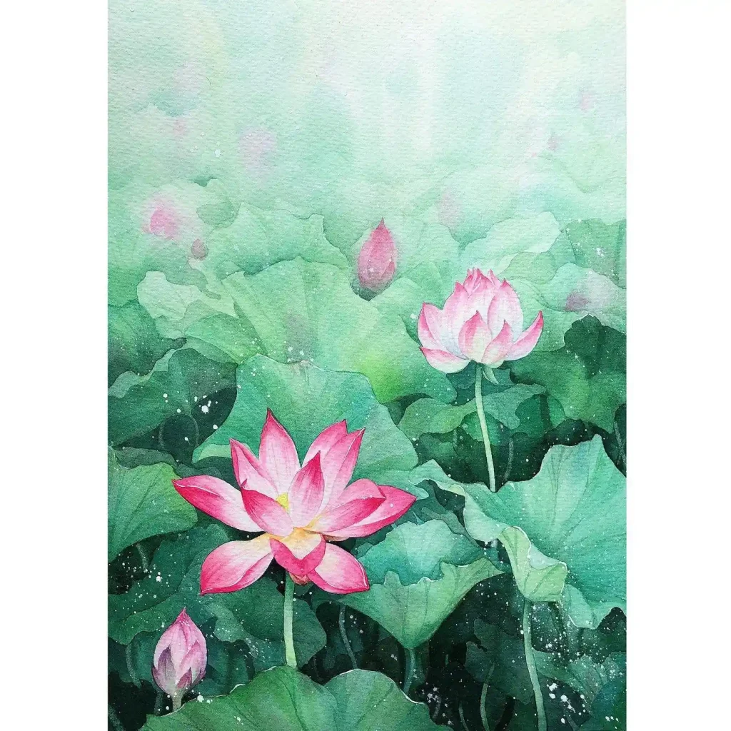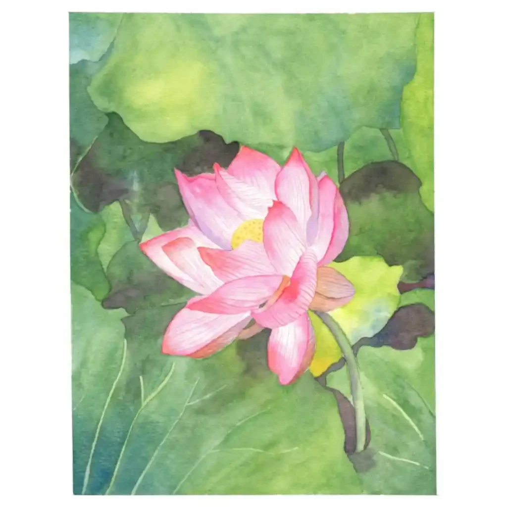 Greenery provides the perfect backdrop for pink florals. Here, a large, soft pink lotus dominates the frame, resting against a background of broad, watery green leaves. The loose wash technique creates a lush, humid atmosphere typical of a summer pond. It captures the fullness of nature where the flower is cradled by the vibrant life surrounding it.