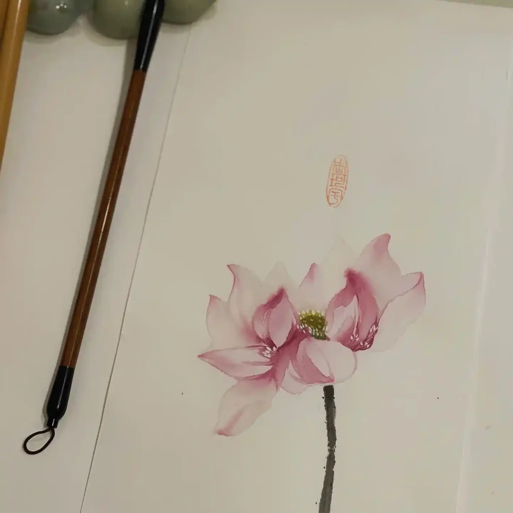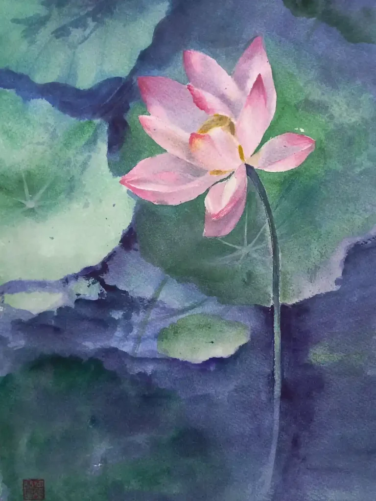 Minimalism creates a powerful impact here. This painting features a single, elegant bloom with petals transitioning from soft pink to deep violet. The long, dark stem anchors the flower to create a strong vertical line. The traditional red seal adds a cultural touch. It honors the lotus as a symbol of purity and perfection in Eastern art.