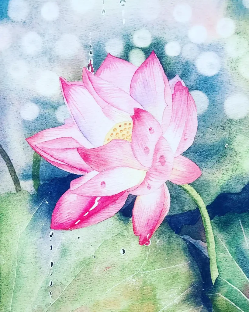 Light plays a magical role in this illustration. A vibrant pink lotus takes center stage against a background of soft, white bokeh circles that mimic dappled sunlight. The vertical water droplets add movement and freshness to the scene. It captures the refreshing energy of a summer rain shower revitalizing the garden.